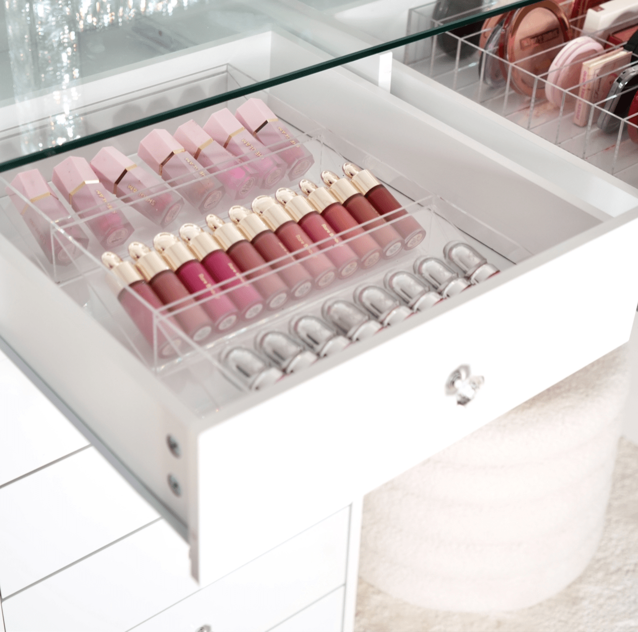 Les tiroirs intégrés offrent un espace de rangement optimal pour vos produits de maquillage, brosses et autres accessoires. Chaque tiroir est conçu pour vous aider à organiser votre espace de manière efficace et élégante.